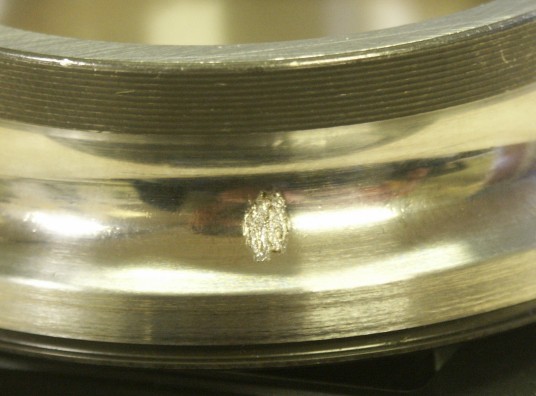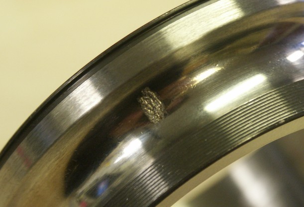 I took the old beaing apart and cleaned it up. Here are a couple of photos of the inner race, of the inboard part of the bearing. They are not easy to photograph, as the undamaged areas are like mirrors.