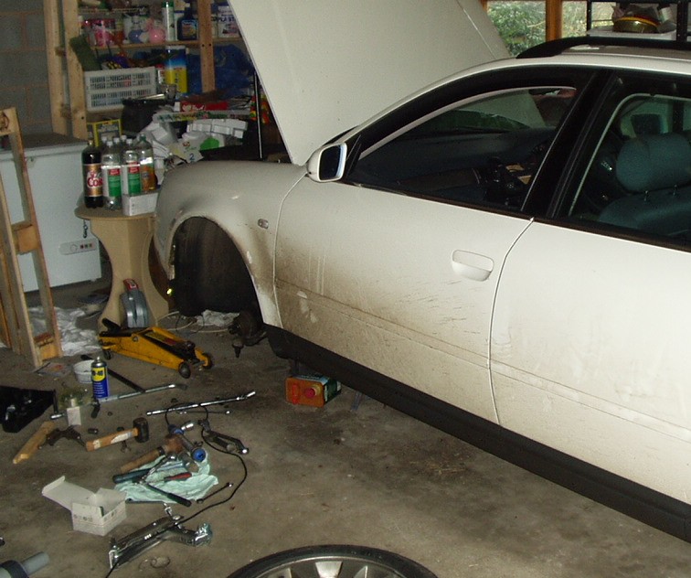 I also wanted a car that I could drive without listening for the wheel bearing on every right-hand corner. I bought a new wheel bearing, and a 17mm allen key (1/2" square drive) to remove the front hub bolt. On Sunday 12th January I took the suspension apart. Here is the car in my gararge, once I had the bearing housing removed.